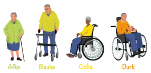 Elk personage staat voor een andere mobiliteitsklasse. Je vindt hier ook voorbeelden van geschikte hulpmiddelen voor elke categorie.